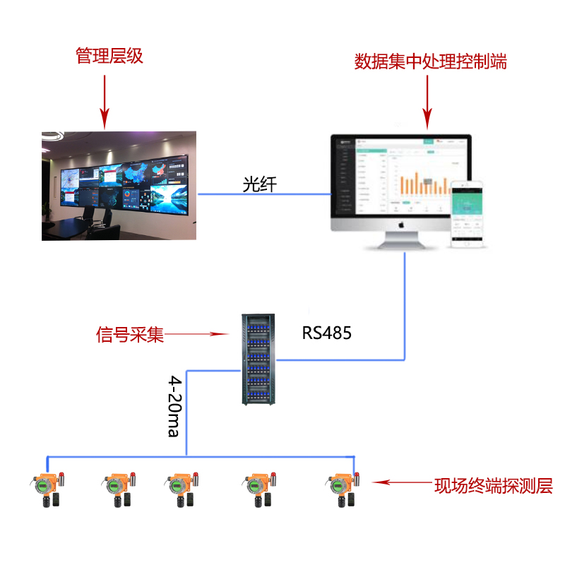 前端介质监控:气体检测报警仪、屏蔽电缆线、光纤、无线模块、交换机、气体报警控制器、PLC、DCS等。